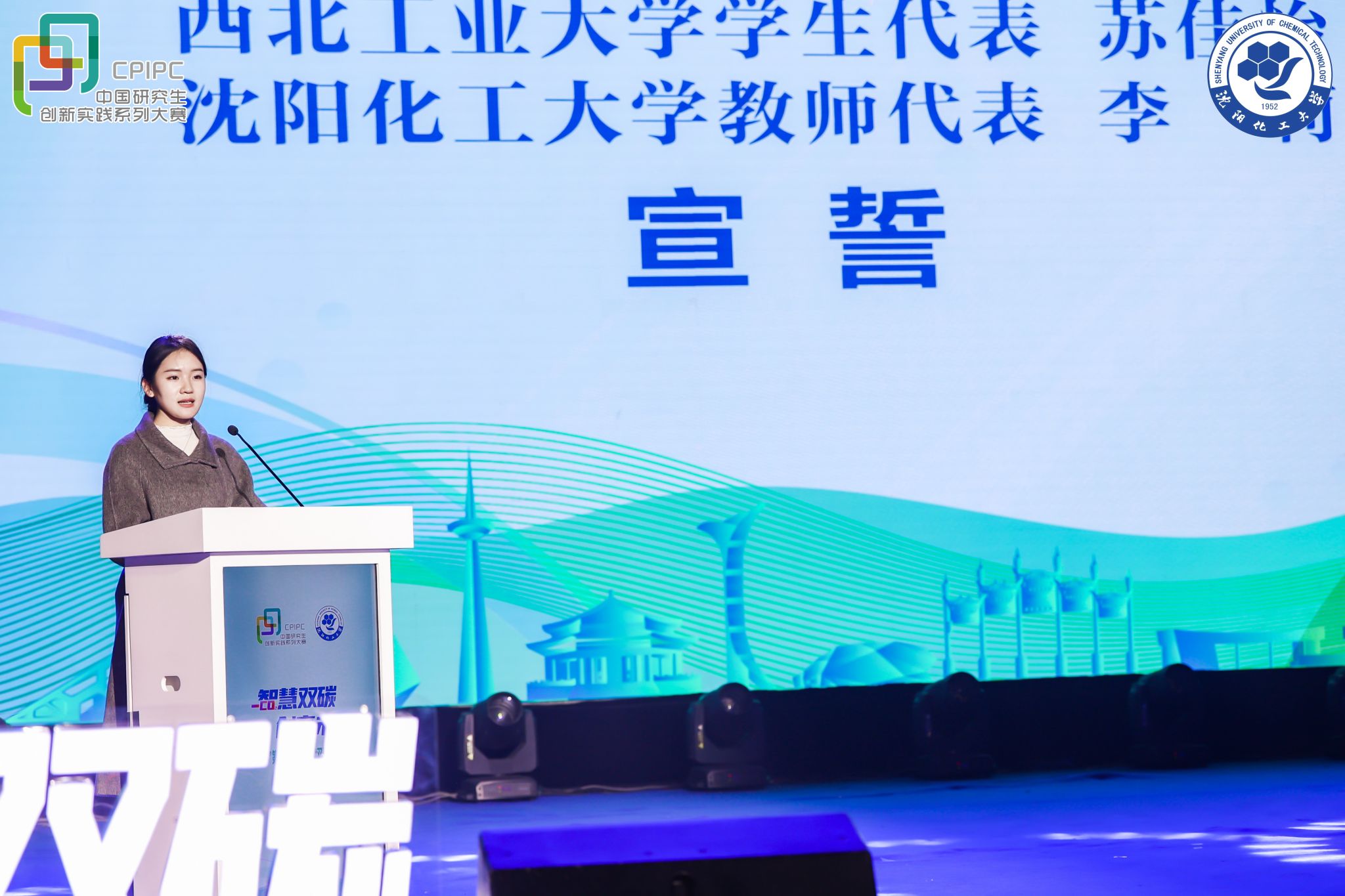 2025级硕士研究生苏佳怡作为唯一参赛学生代表,面向全体评委和师生庄严宣誓,承诺以严谨态度展现创新成果,以奋斗精神践行双碳使命,展现了我校学子坚守诚信、追求卓越的精神风貌与服务国家战略的坚定信念。