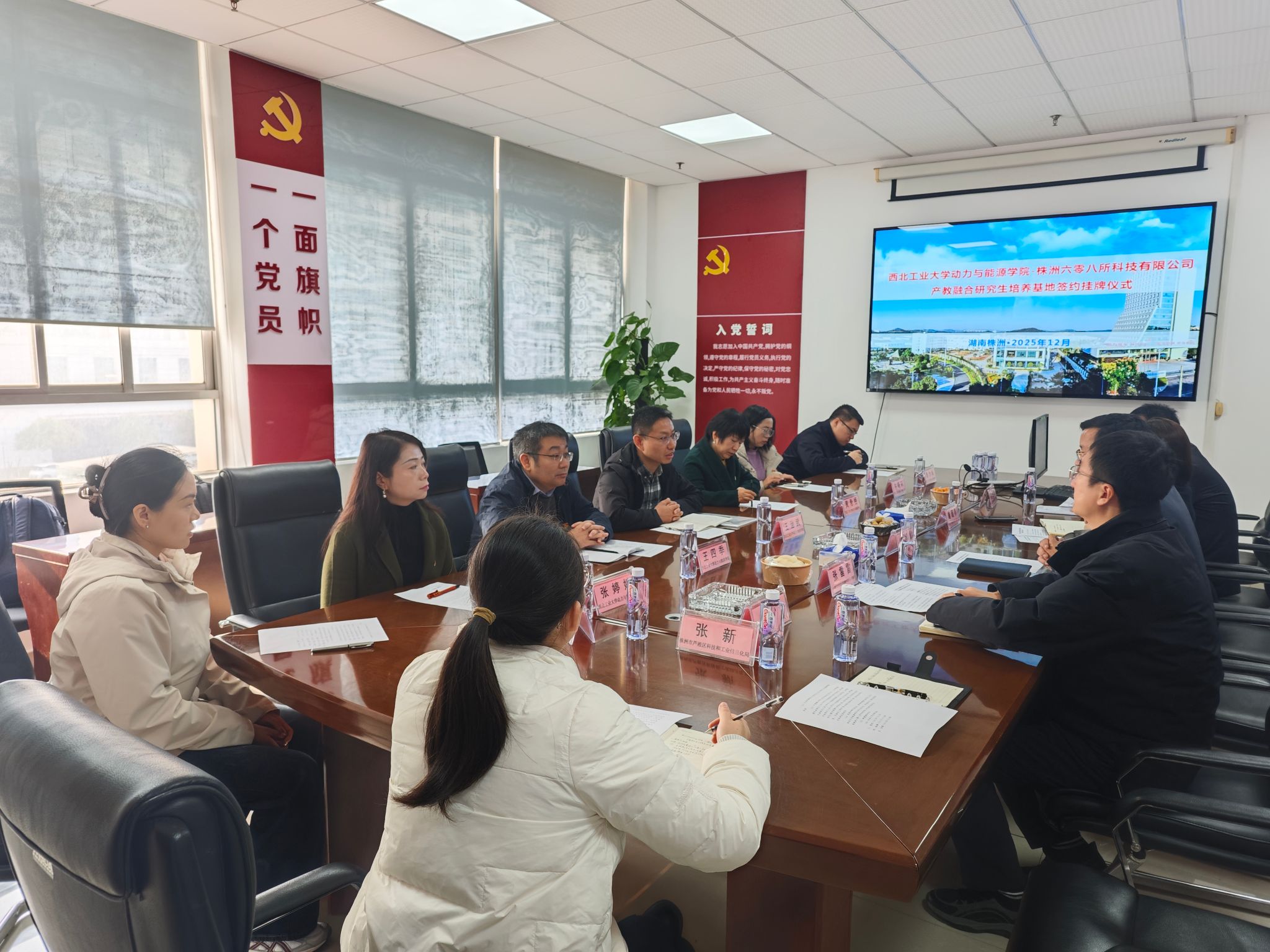 副院长王治武一行7人赴株洲六零八所科技有限公司签署产教融合研究生培养基地协议并与企业导师进行座谈交流。株洲市芦淞区科技和工业信息化局党组书记曾超群和副局长张新、中国航发湖南动力机械研究所人力资源部副部长张雷雷、株洲六零八所科技有限公司总经理曾培能和副总经理王斌以及各部门经理参会,会议由株洲六零八所科技有限公司党支部书记李迎春主持。