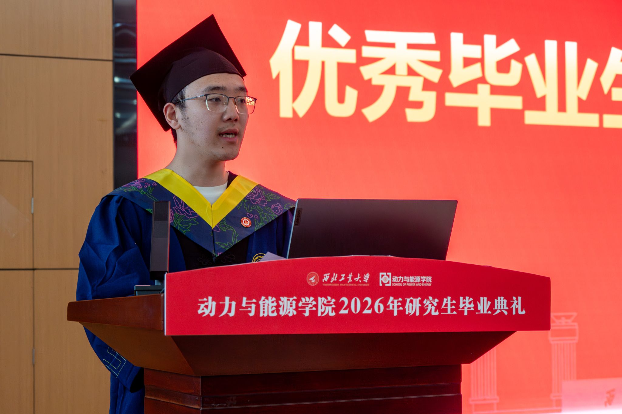 优秀毕业生代表张峻同学深情回顾了入学以来的成长点滴,并代表全体毕业生向母校与老师的悉心栽培致以诚挚谢意,同时感谢家人的一路陪伴与温暖支持。他也寄语同窗,祝愿大家前程似锦、未来可期。