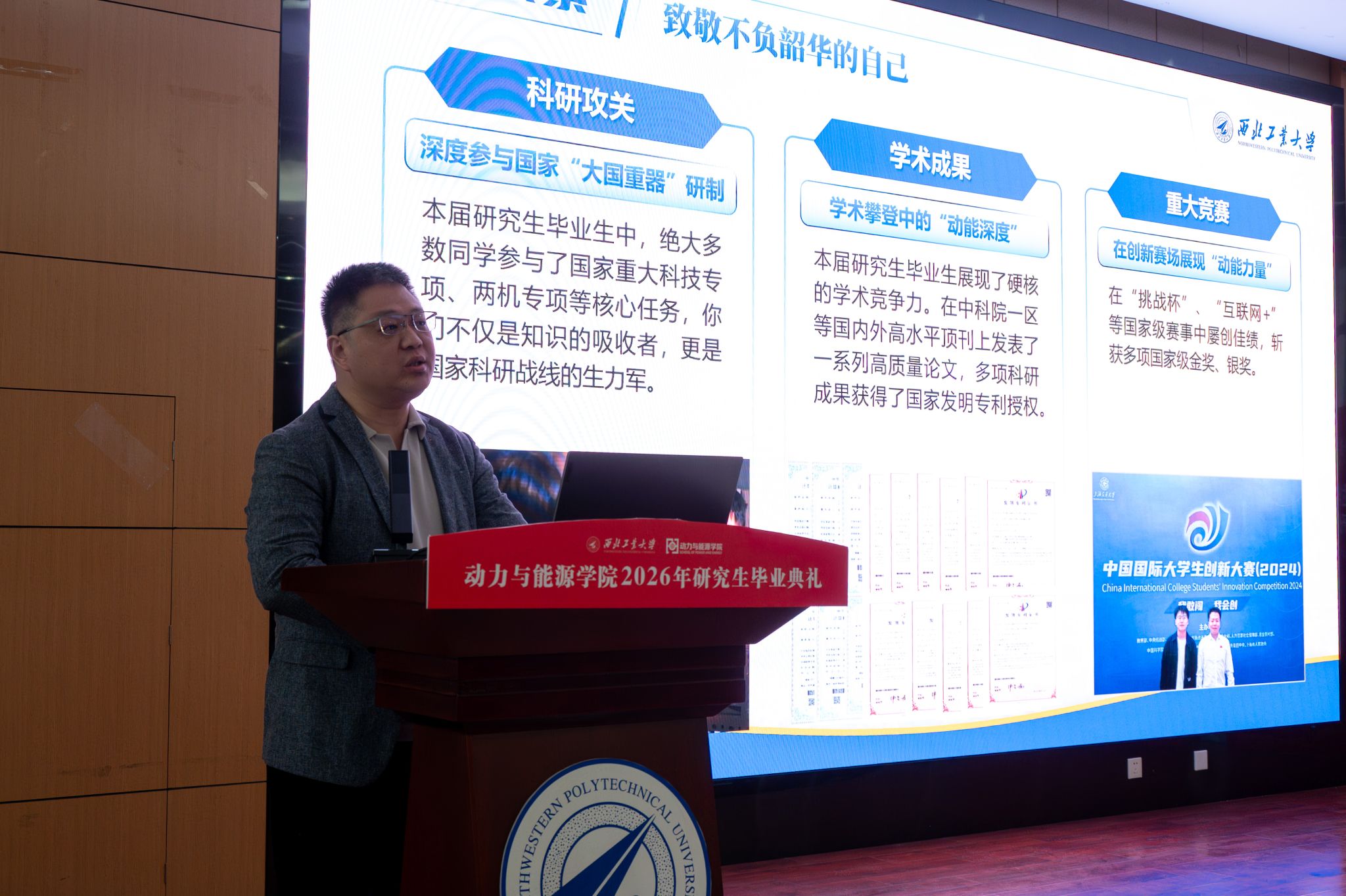 课程伊始,李磊回顾了毕业生们在学期间取得的优异成绩,并给予高度肯定。他指出,同学们积极参与国家重大科技专项攻关,在学术前沿发表多项高水平研究成果,并在“挑战杯”等高水平学科竞赛中屡获佳绩,充分展现了动能学子扎实的专业基础、创新的学术精神和昂扬的奋斗风貌。